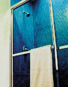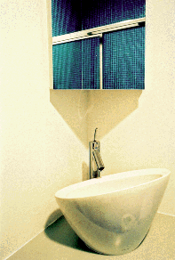 Mexican glass tile sparkles on the bathroom floor and in the shower; skylights let the natural light illuminate the Corian counter and modernistic sink and Philip Stark faucet.